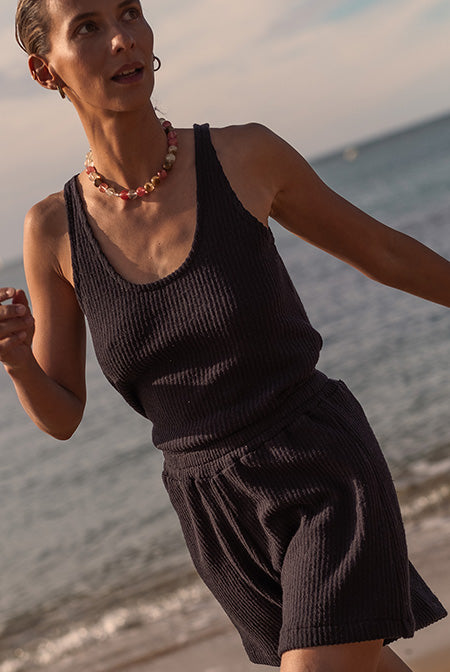 95% des matières de la collection 2025 sont tricotées en Espagne ou en Italie puis nos créations prennent vie dans l’un de nos deux ateliers en Tunisie et au Portugal.